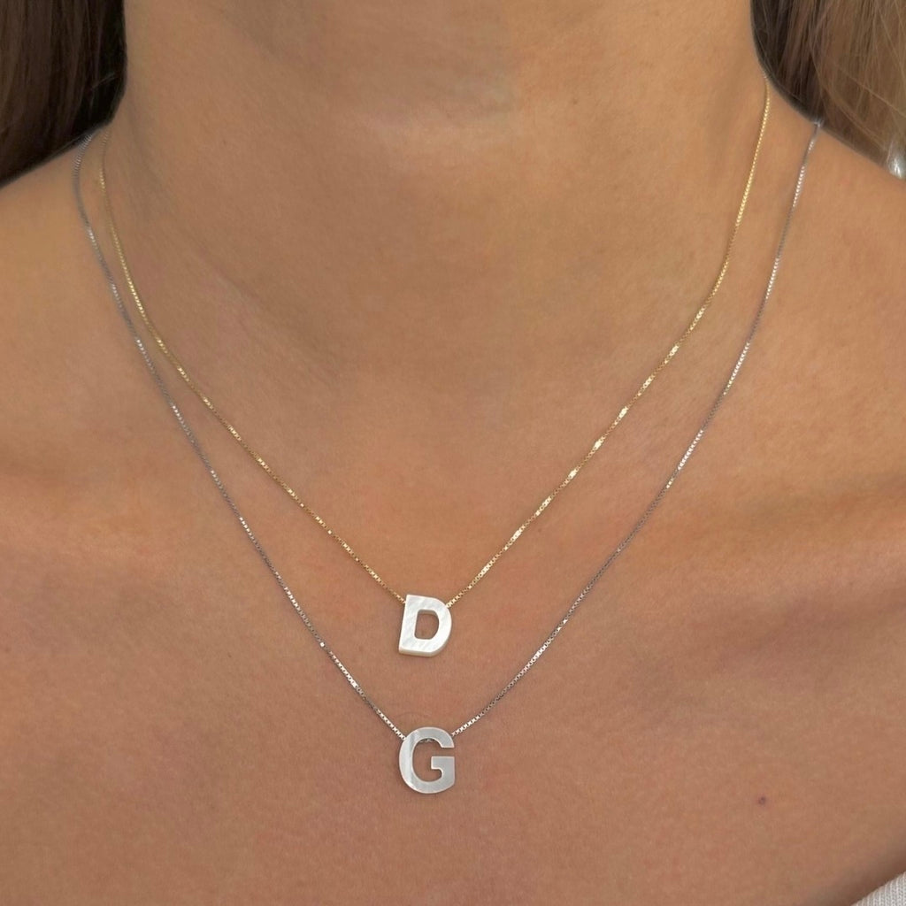 - Dimensiones: Dije 1,2 cm de alto x 1,2 cm de ancho (dependiendo la letra) - Cadena graduable mide 40 cm + cadena de extensión que llega hasta 45cm.