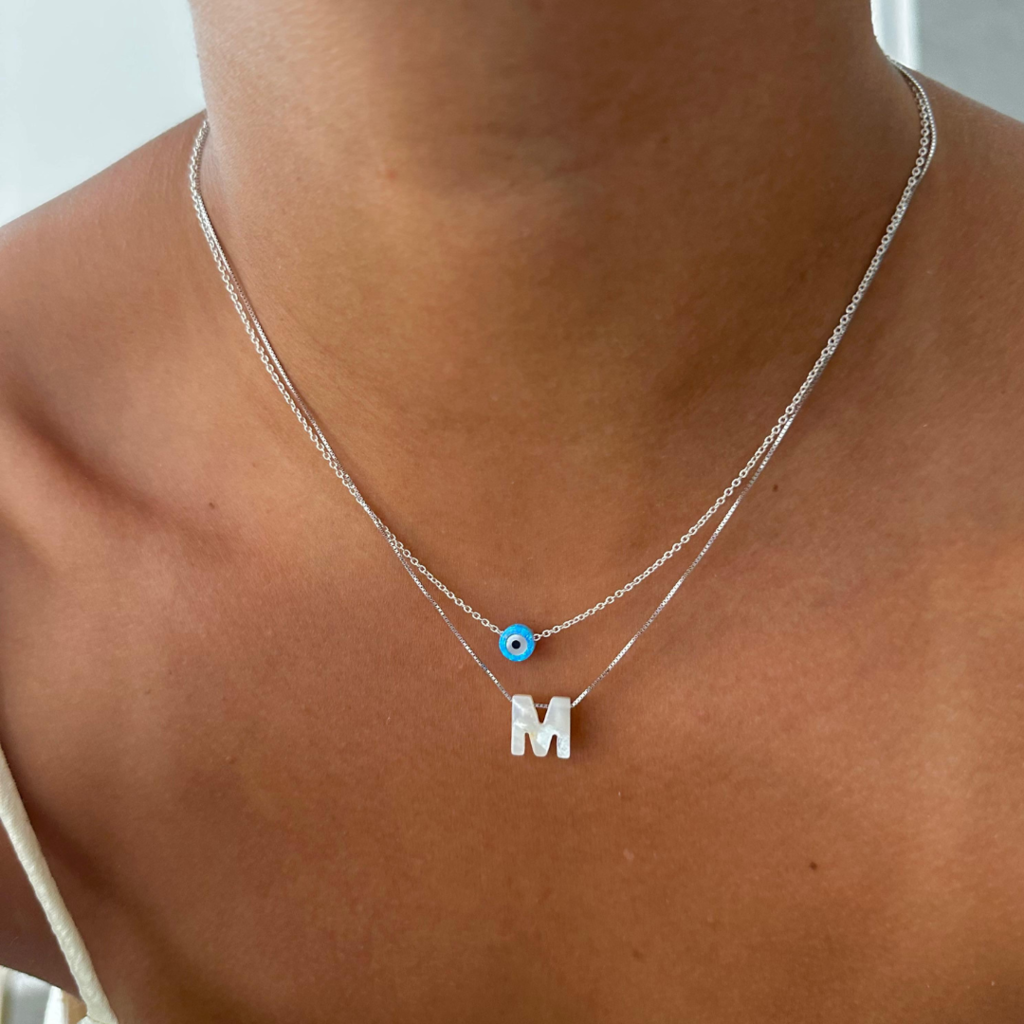 - Material: Plata 925 rodinada, ojo en ópalo e inicial en madre perla.